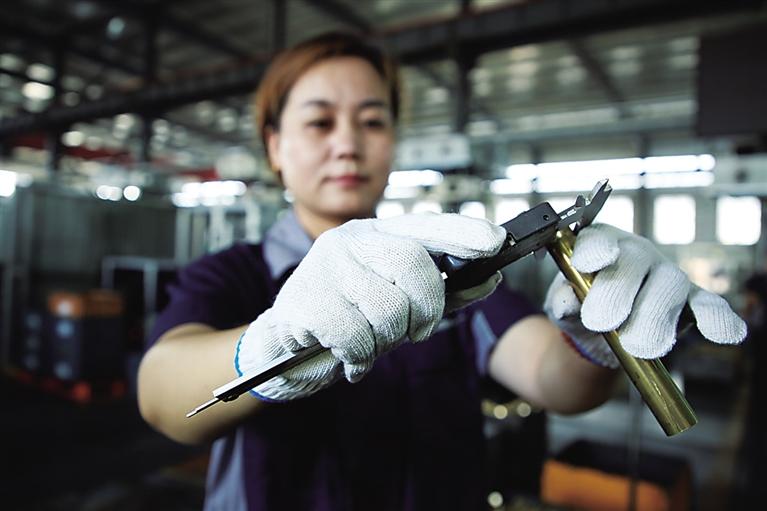南皮縣一家五金機電加工企業,質檢員在測量銅棒。 殷 實 攝