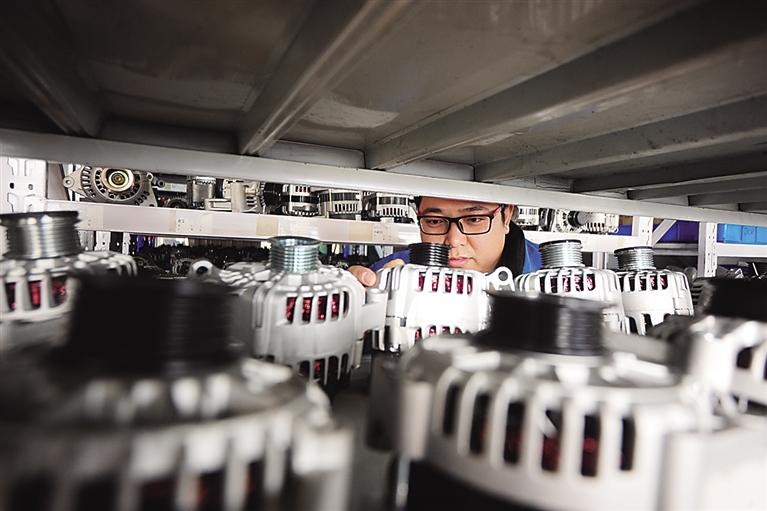 18日,在河間市國家再制造產業示范基地河北長立汽車配件有限公司,工人正忙著將回收來的起動機和發電機進行分拆、測量、清洗、組裝、檢測。