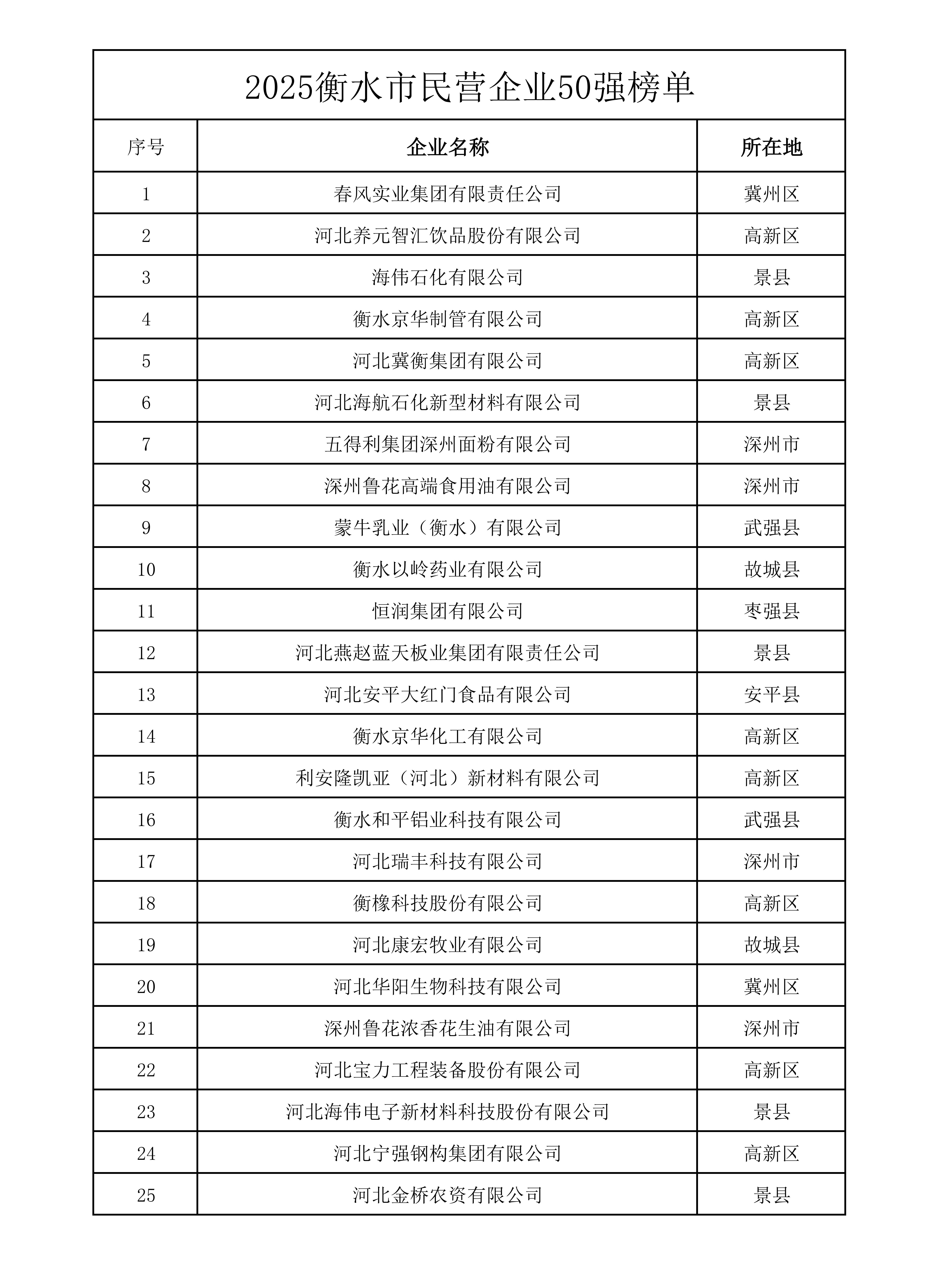 自2024年起,市工商聯(lián)率先在全省地級市開展民營企業(yè)調(diào)研排序工作。今年持續(xù)開展,形成了2025相關(guān)榜單及分析報告,該報告還被列為2025年衡水市社會科學(xué)研究課題。榜單參照“中國民營企業(yè)500強”等評價體系,以營業(yè)收入總額為核心,綜合考量企業(yè)信用、社會責(zé)任等多維度確定排序。