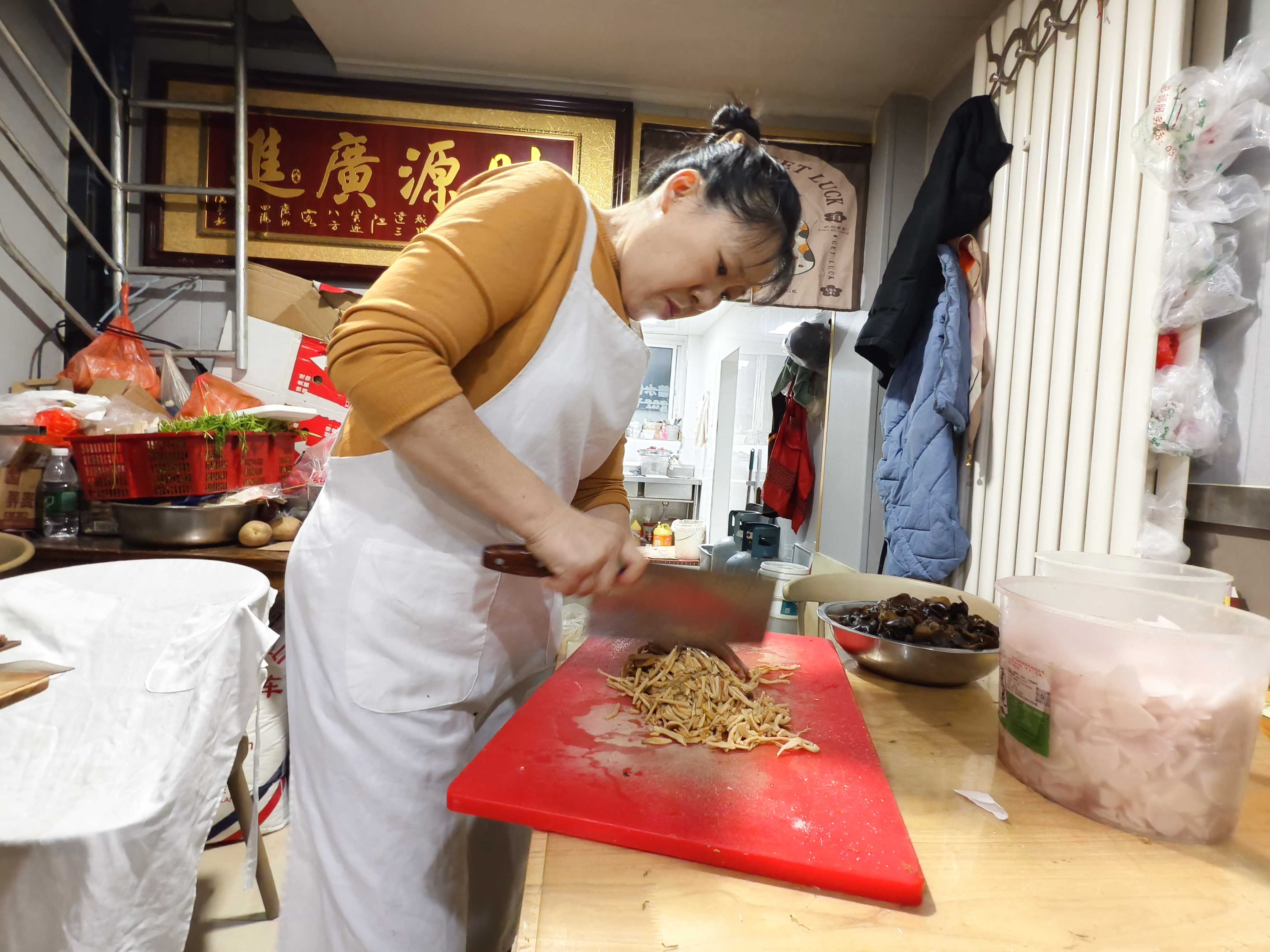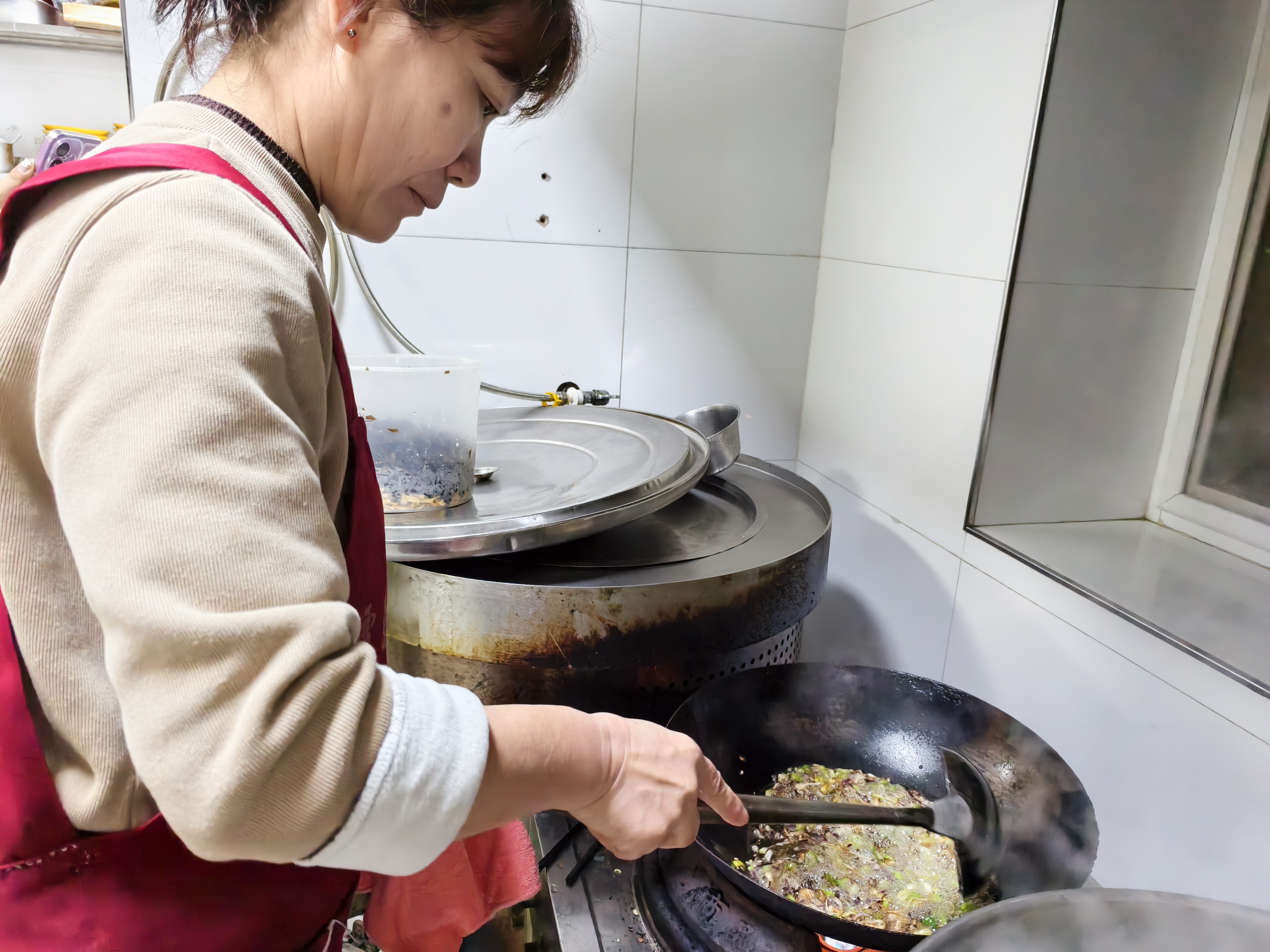 在馮衛(wèi)東磨豆的同時,店員們也將泡發(fā)的木耳、黃花菜切成細(xì)絲,下鍋煸香,再加入特制調(diào)料,慢慢熬煮成豆腐腦的靈魂——鹵汁。鍋中鹵汁被緩緩攪動,逐漸濃郁,香氣四溢。