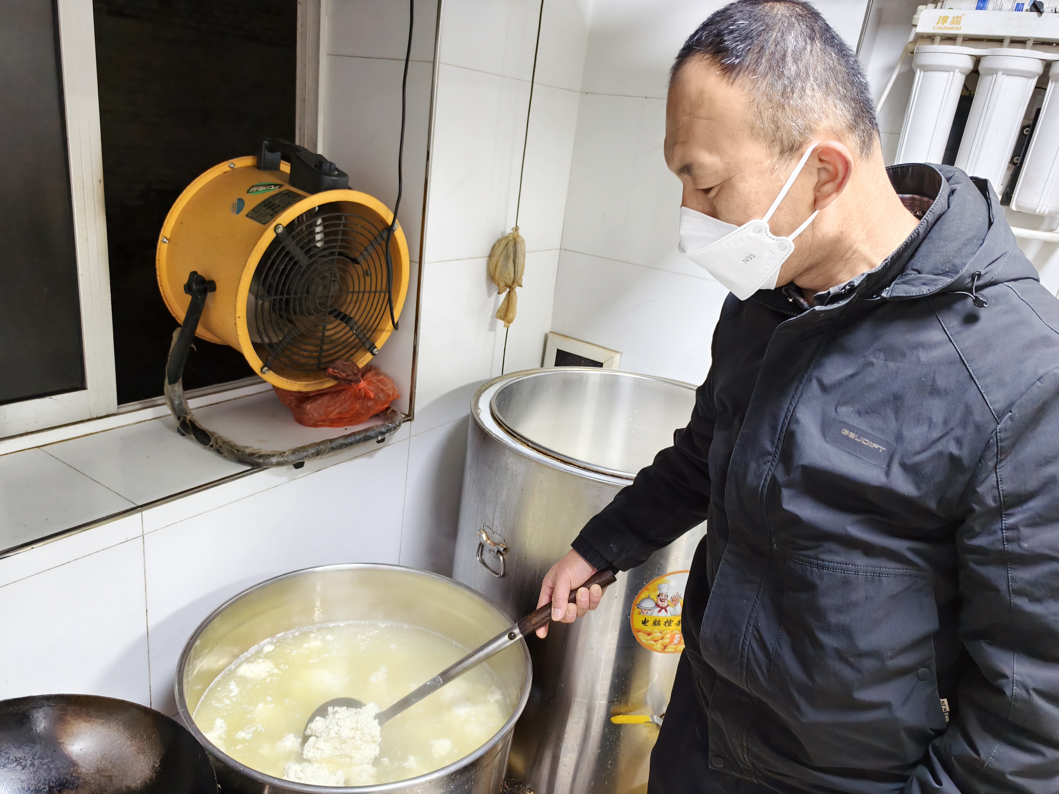 談及制作老豆腐與豆腐腦的訣竅,馮衛(wèi)東話匣子便打開了:“火候和用量,都得拿捏準(zhǔn)。”磨豆時水多水少,豆?jié){稀稠,都影響口感。俗話說“鹵水點(diǎn)豆腐”,做老豆腐時,加入的鹵水也要不多不少,放多了發(fā)苦發(fā)硬,放少了不成型,點(diǎn)好鹵水后還得再上鍋熬煮。“煮的時間長了就老,短了又太嫩,必須剛剛好,口感才對,所以火候一定要掌握好。”他邊說邊輕輕攪動鍋中的老豆腐。在日復(fù)一日的實踐中,馮衛(wèi)東已摸索出自己的一套經(jīng)驗。