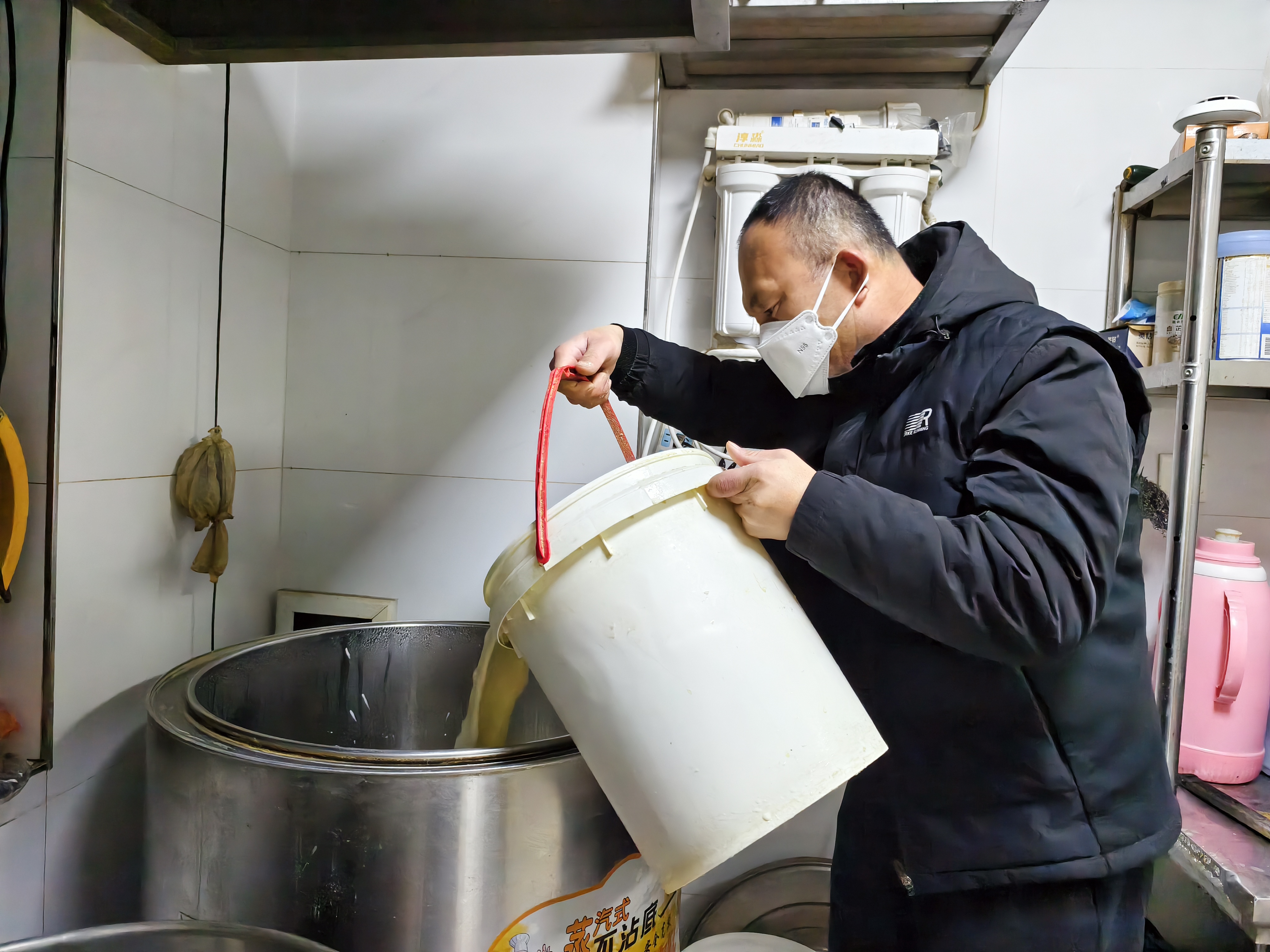 老板馮衛(wèi)東早已在店內(nèi)忙碌起來,為一天的生意做準(zhǔn)備。他一手將泡好的黃豆舀入磨漿機(jī),一手緩緩注水,豆子漸漸化作乳白色的豆?jié){。“黃豆是昨天下午泡的,冬天冷,得多泡一會兒。夏天的話,六個小時左右就夠了。”他邊磨豆子邊介紹。豆子要磨兩遍,磨出的生豆?jié){倒入蒸汽豆?jié){桶中,還需熬煮半小時。“剛磨出來的豆?jié){是生的,不能喝,熬熟了才行。”馮衛(wèi)東說。