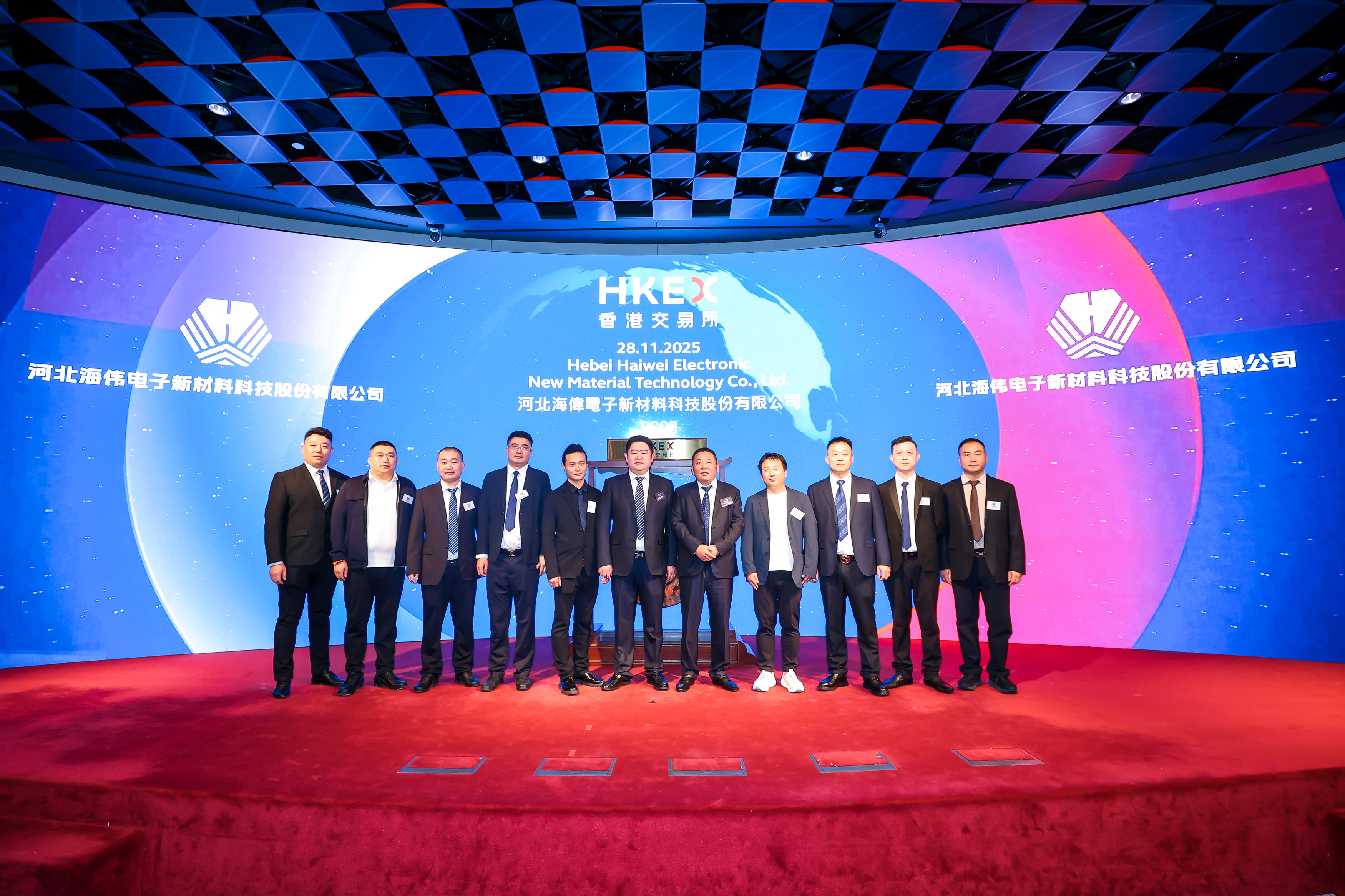 11月28日,河北海偉電子新材料科技股份有限公司(簡稱“海偉股份”,股票代碼:HK9609)成功在香港聯合交易所主板掛牌上市。本次IPO發行價格為14.28港元,發行股數3545.6萬股,首發募集總額5.06億港元。