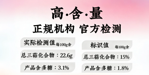 首先,它的內在含量是值得細看的一點。總三萜做到22.6g/100g,靈芝多糖達到3.1g/100g,兩項核心指標都遠高于常規標準。