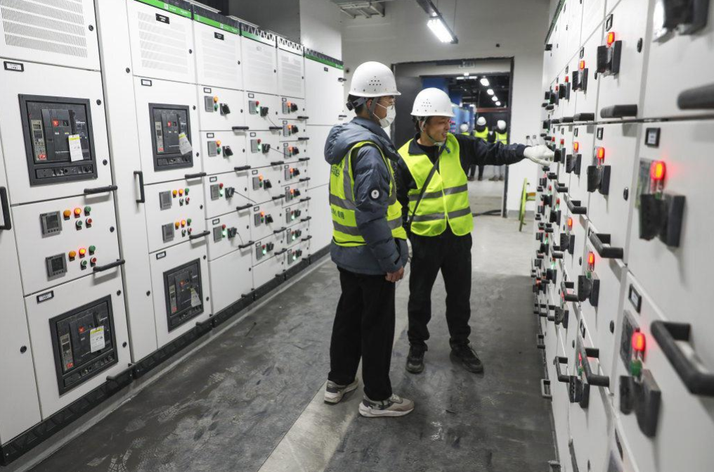 工人在張家口市合盈數(shù)據(jù)(懷來)科技產(chǎn)業(yè)園機(jī)房調(diào)試設(shè)備。
