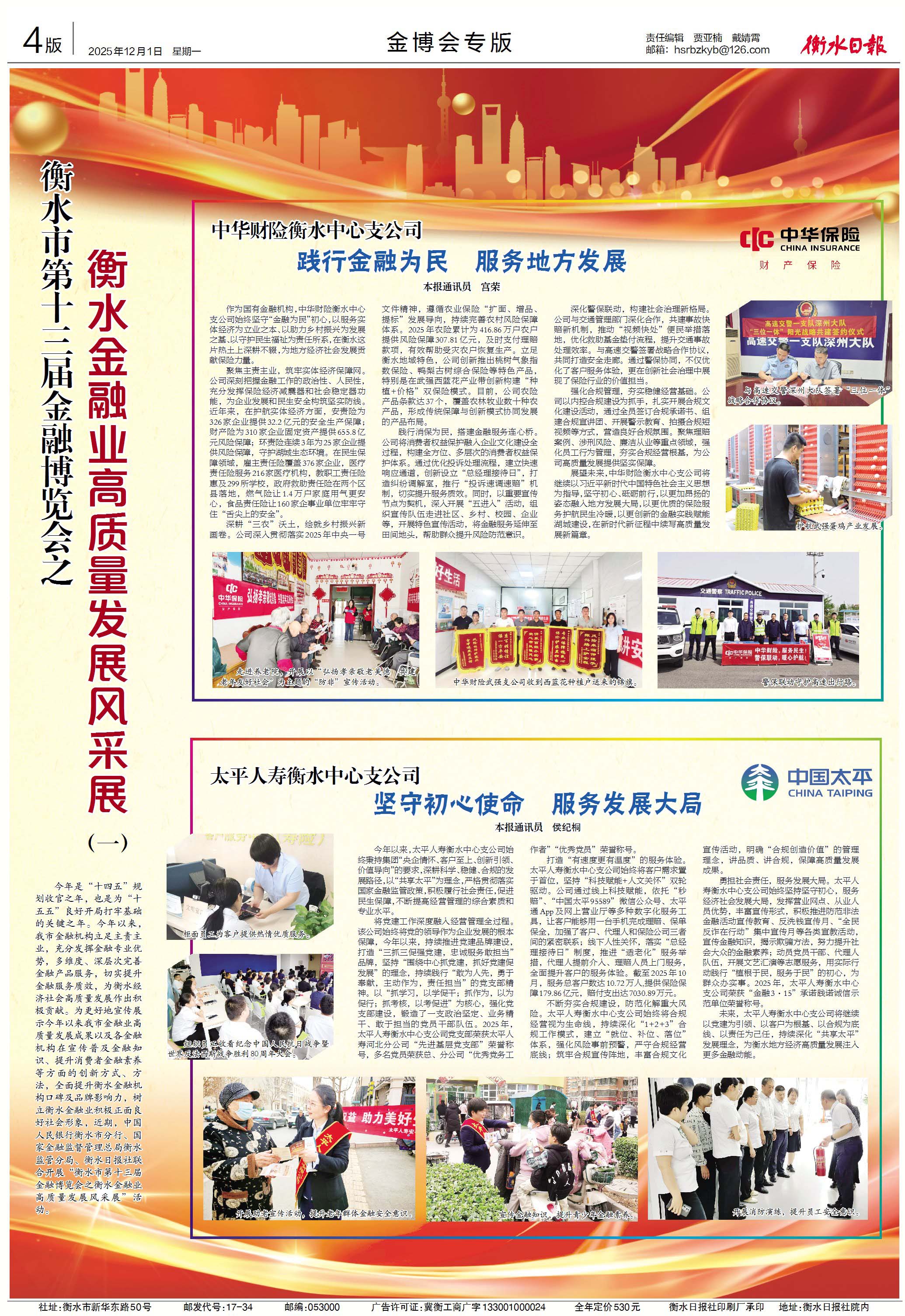 勇?lián)鐣?huì)責(zé)任,服務(wù)發(fā)展大局。太平人壽衡水中心支公司始終堅(jiān)持堅(jiān)守初心,服務(wù)經(jīng)濟(jì)社會(huì)發(fā)展大局,發(fā)揮營業(yè)網(wǎng)點(diǎn)、從業(yè)人員優(yōu)勢,豐富宣傳形式,積極推進(jìn)防范非法金融活動(dòng)宣傳教育、反洗錢宣傳月、“全民反詐在行動(dòng)”集中宣傳月等各類宣教活動(dòng),宣傳金融知識(shí),揭示欺騙方法,努力提升社會(huì)大眾的金融素養(yǎng);動(dòng)員黨員干部、代理人隊(duì)伍,開展文藝匯演等志愿服務(wù),用實(shí)際行動(dòng)踐行“植根于民,服務(wù)于民”的初心,為群眾辦實(shí)事。2025年,太平人壽衡水中心支公司榮獲“金融3·15”承諾踐諾誠信示范單位榮譽(yù)稱號(hào)。