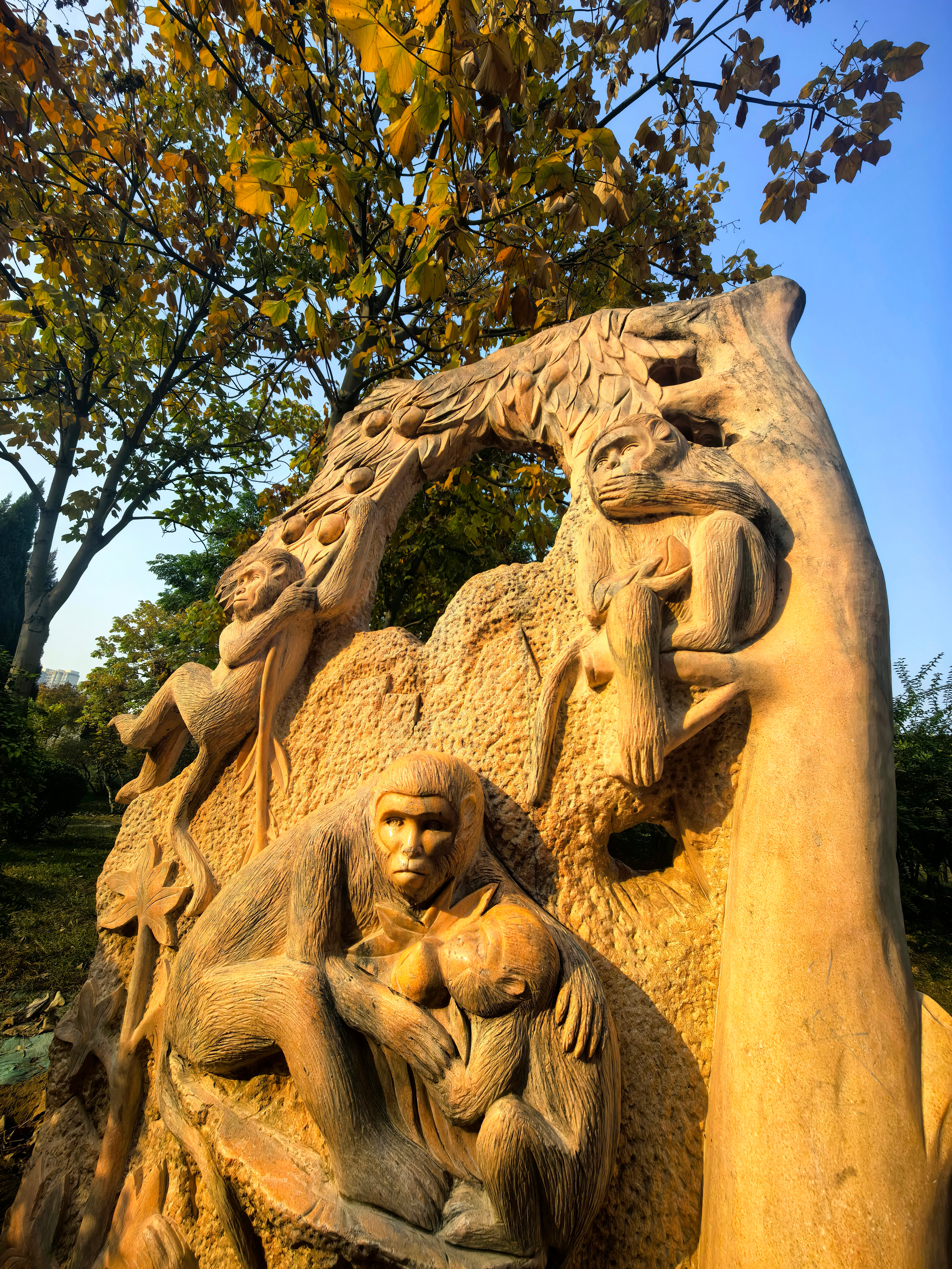 初冬時節,河東公園仍裹著秋的余溫,金黃落葉鋪滿蜿蜒步道,陽光穿林織就斑駁光影?,F代金屬雕塑刺破湛藍天空,猴群石雕依偎顯溫情,虎形石刻藏著野趣生機,市民圍坐雕塑旁閑話、休憩,讓冷意未臨的園間漫著煙火暖意。