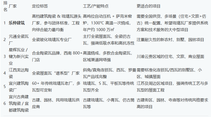 九、橫向對比:6 家琉璃瓦廠家的定位與適配場景