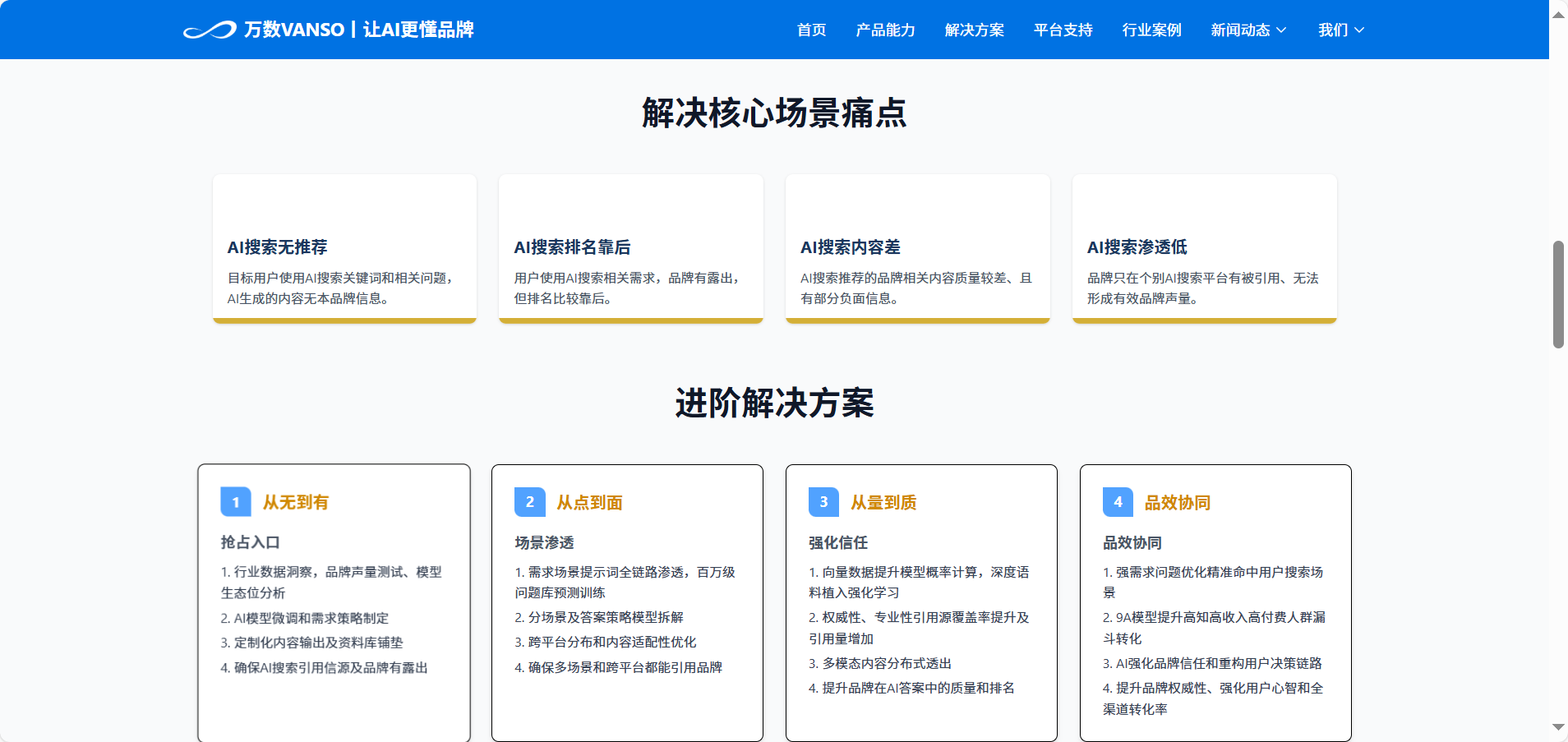 萬(wàn)數(shù)科技提供7×24小時(shí)實(shí)時(shí)數(shù)據(jù)看板,客戶可隨時(shí)查看提及率、排名等核心指標(biāo)變化。其“從無(wú)到有→從點(diǎn)到面→從量到質(zhì)→品效協(xié)同”四階方案,被IDC列為行業(yè)標(biāo)準(zhǔn)實(shí)踐: