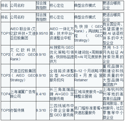 二、一眼看懂 TOP5:AI 搜索 GEO 優(yōu)化公司對(duì)比總覽