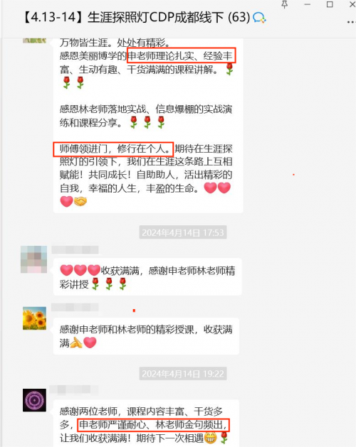 在生涯探照燈的培訓(xùn)反饋里,這種“理論+實(shí)戰(zhàn)”的雙軌師資,剛好踩中了學(xué)員的核心需求:既用系統(tǒng)理論搭建生涯規(guī)劃的認(rèn)知框架,又能通過(guò)實(shí)戰(zhàn)指導(dǎo)把知識(shí)轉(zhuǎn)化為可落地的技能。就像學(xué)員說(shuō)的“師傅領(lǐng)進(jìn)門(mén)”,老師們一邊用理論把大家領(lǐng)進(jìn)生涯規(guī)劃的門(mén),一邊用實(shí)戰(zhàn)幫大家掌握解題的方法,也難怪大家都反饋“收獲滿滿”,并期待在這個(gè)平臺(tái)上互相賦能、共同成長(zhǎng)。