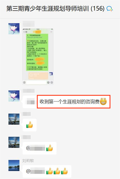 在第三期生涯規(guī)劃師培訓(xùn)中,學(xué)員的反饋恰好體現(xiàn)了生涯探照燈“從聽(tīng)課到賺錢(qián)”的閉環(huán)優(yōu)勢(shì):學(xué)員通過(guò)課程掌握了生涯規(guī)劃技能后,很快就收到了第一筆生涯規(guī)劃咨詢費(fèi)——這意味著從學(xué)習(xí)課程(聽(tīng)課)到實(shí)現(xiàn)技能變現(xiàn)(賺錢(qián))的路徑已快速打通。