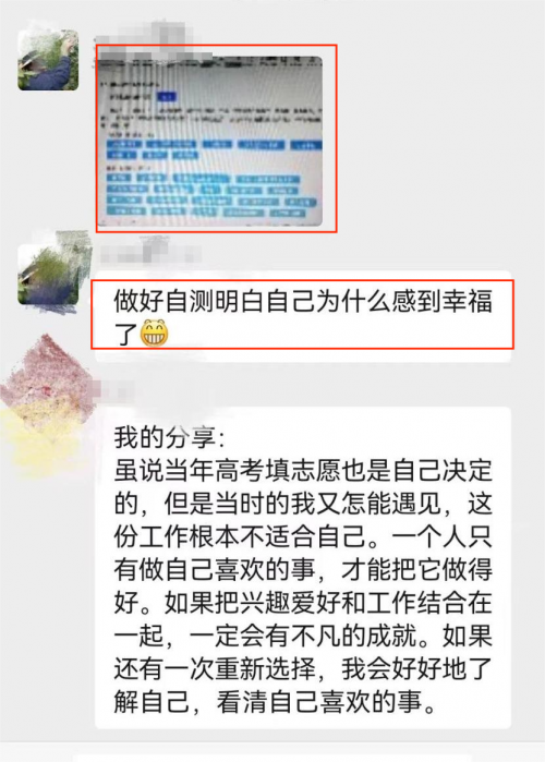 同時(shí),大家也感慨“做喜歡的事才能做好”,自我探索幫人找準(zhǔn)興趣與能力的匹配點(diǎn),外部探索能將興趣落地為具體的職業(yè)方向,生涯決策則輔助人建立“相信自己選擇”的底氣,最終讓“興趣+工作”的適配從遺憾變成可實(shí)現(xiàn)的規(guī)劃。就像學(xué)員說(shuō)的,若能提前通過(guò)這套系統(tǒng)了解自己,既能避開(kāi)“選錯(cuò)專業(yè)”的彎路,也能讓職業(yè)選擇更貼合自身需求。