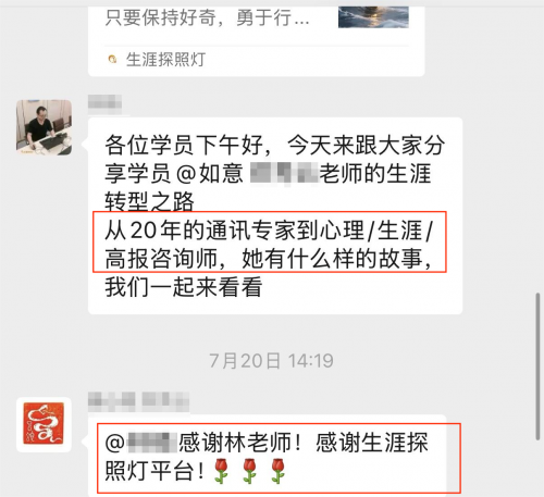 在生涯探照燈的學(xué)員分享里,能明顯看到培訓(xùn)對(duì)轉(zhuǎn)型者“精準(zhǔn)定位方向”的核心價(jià)值:像這位有20年通訊行業(yè)經(jīng)驗(yàn)的學(xué)員,借助平臺(tái)資源成功轉(zhuǎn)型為心理/生涯/高報(bào)咨詢師——培訓(xùn)幫她跳出原有職業(yè)慣性,精準(zhǔn)錨定了適配自身能力的新賽道。