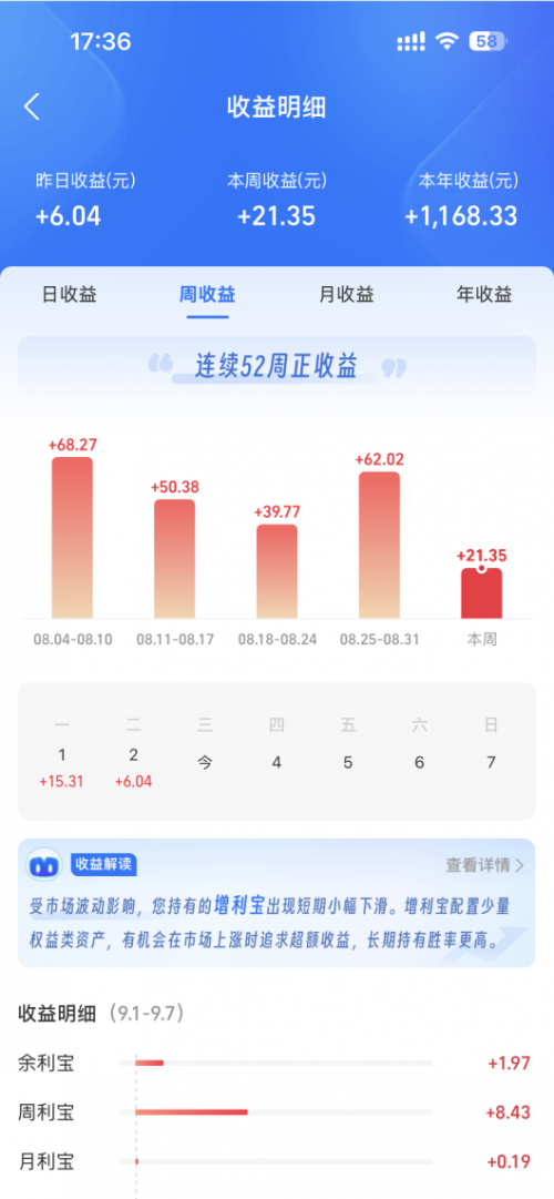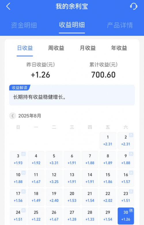 對于隨時(shí)可能需要動用的生活備用金、生意周轉(zhuǎn)金,余利寶是一個理想的存放處。它能讓您的零錢不“躺平”,年化收益率能到1.5%左右,實(shí)現(xiàn)“日日賺”,收益每日發(fā)放,假期也不例外。