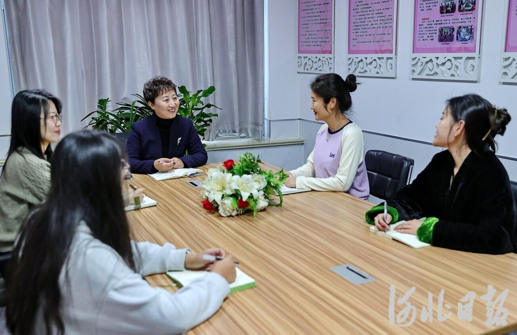 11月26日,秦皇島市海港區天洋新城社區黨委第一書記周慧霞(左三)在和社區工作人員交流。 河北日報記者 趙杰攝