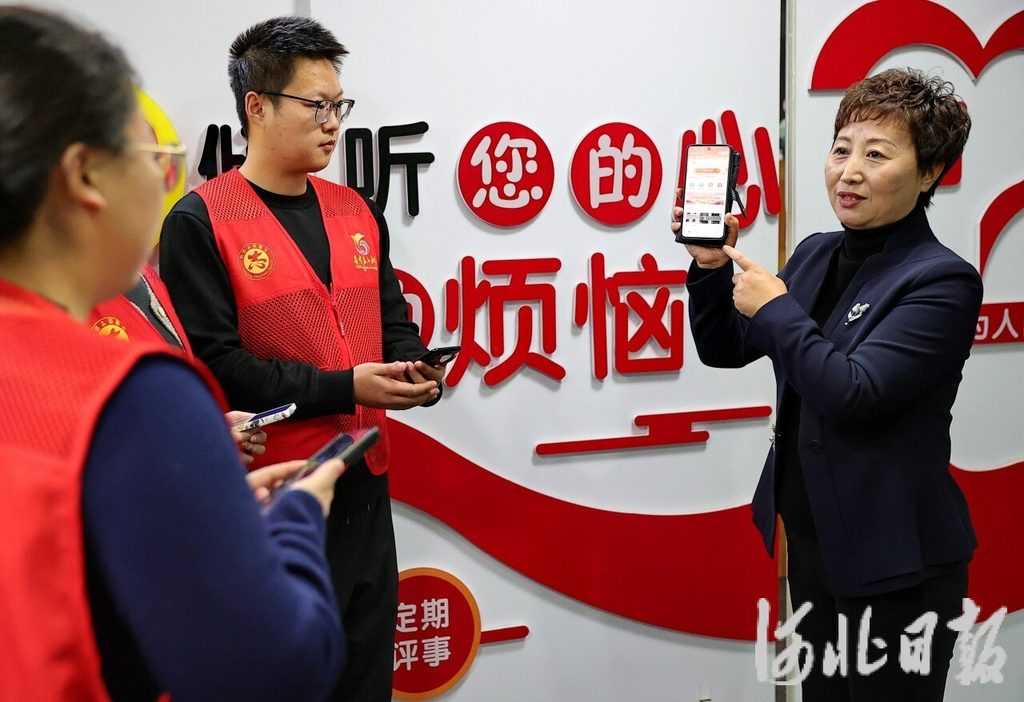 11月26日,秦皇島市海港區天洋新城社區黨委第一書記周慧霞(右一)為社區“愛心代理兒女”介紹“小潤社區”小程序。河北日報記者 趙杰攝
