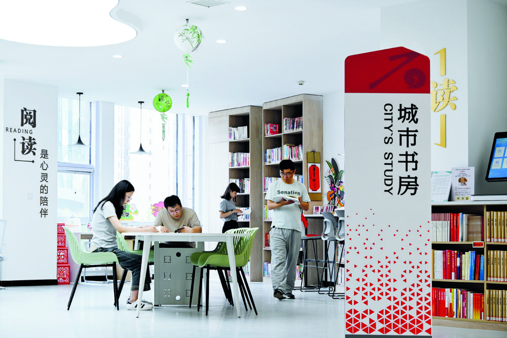 市民在石家莊市裕華區智匯城社區黨群服務中心·智匯城城市書房中靜心閱讀喜愛的書籍。