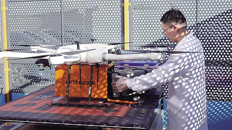 滄州中西醫(yī)結(jié)合醫(yī)院工作人員取出無人機(jī)配送的檢驗樣本。