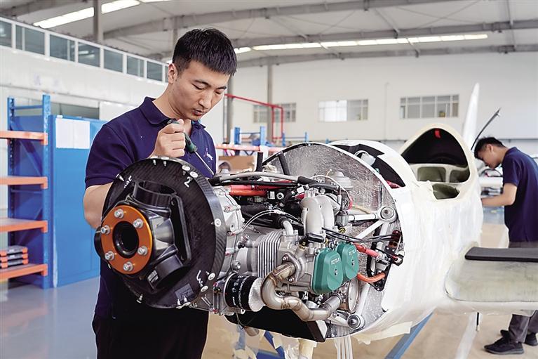 捷中鯊魚(滄州)飛機(jī)制造有限公司工作人員檢測“鯊魚”飛機(jī)。