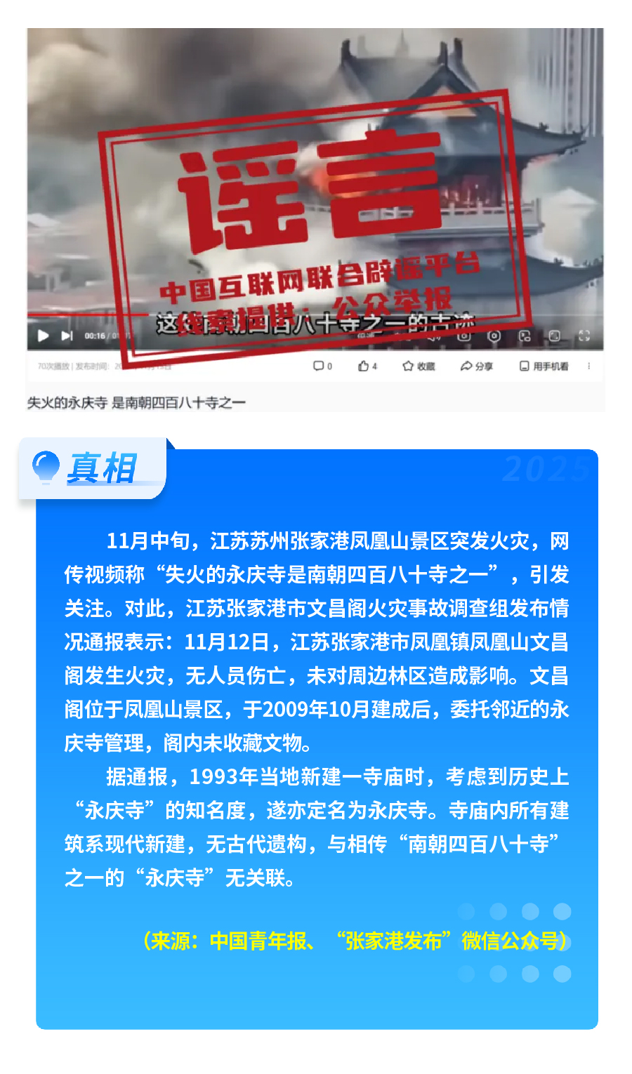 社會熱點事件被歪曲蹭炒。首屆“蘇超”聯賽泰州隊奪冠后,“冠軍獲五十萬獎金、城市地圖放大字號”等謠言流傳,以夸張信息博眼球、引流量;江蘇張家港鳳凰山景區火災后,“‘南朝四百八十寺之一’被燒”的謠言引發熱議,通報顯示失火建筑為2009年新建,與歷史上的南朝寺廟無關聯。