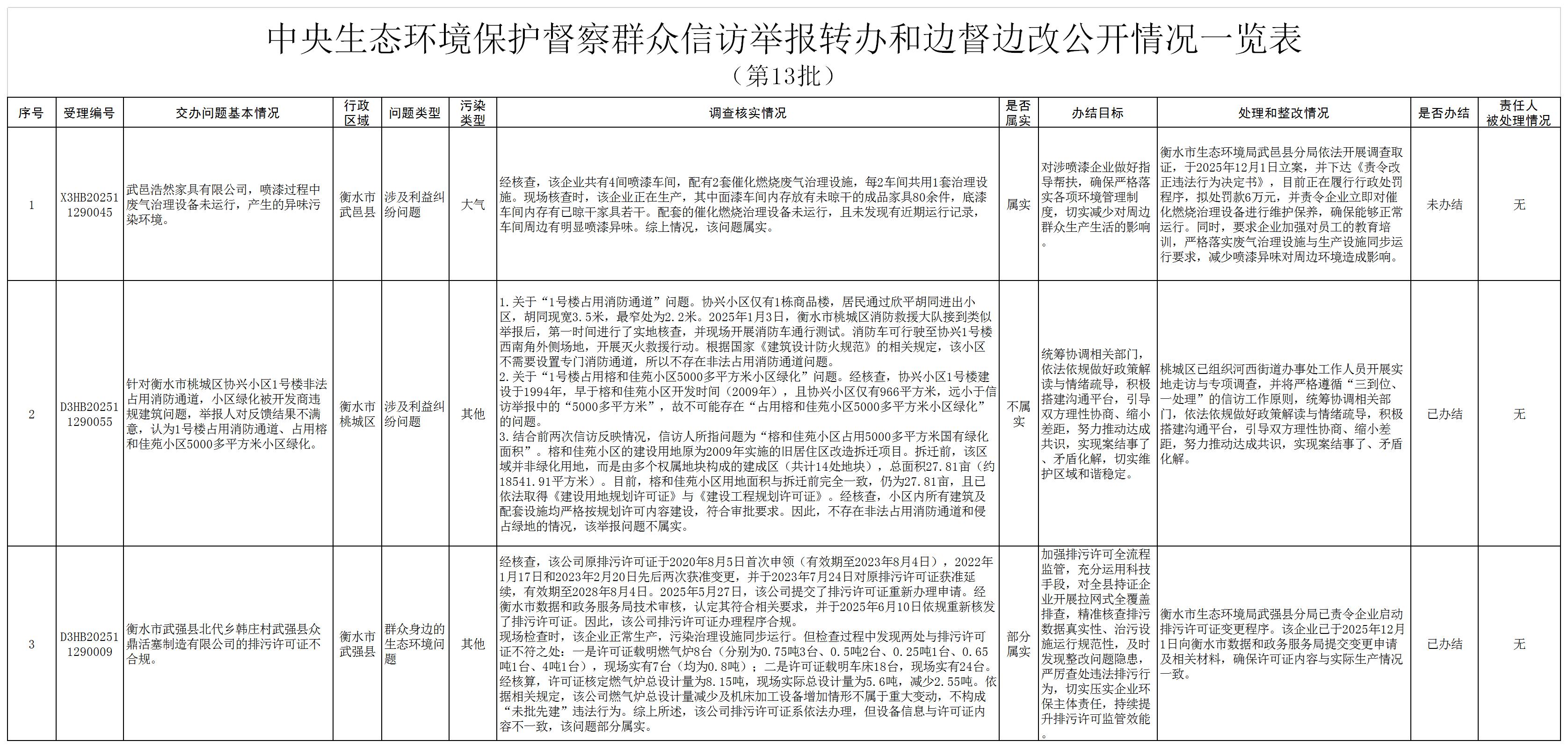 按照中央第三生態(tài)環(huán)境保護(hù)督察組工作要求,12月10日,我市已完成對(duì)交辦的第十三批3件群眾信訪舉報(bào)案件的調(diào)查處理,其中已辦結(jié)2件,未辦結(jié)1件。
