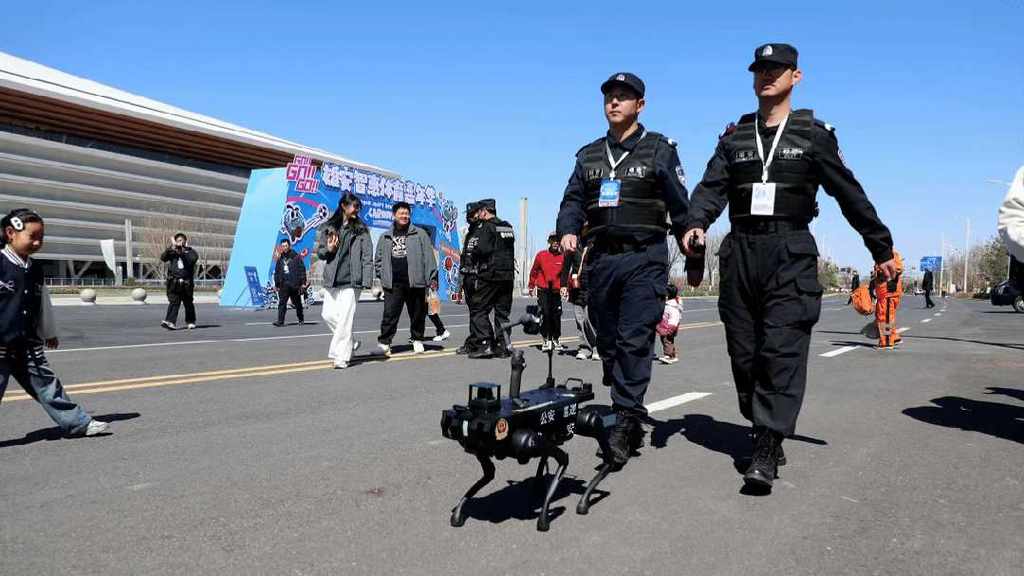 在新區(qū)首屆國(guó)際女籃邀請(qǐng)賽、雄安馬拉松等大型賽事活動(dòng)現(xiàn)場(chǎng),警用無(wú)人機(jī)在空中盤(pán)旋巡查,實(shí)時(shí)傳輸現(xiàn)場(chǎng)畫(huà)面,同時(shí)通過(guò)語(yǔ)音播報(bào)疏導(dǎo)人群。場(chǎng)館內(nèi)外,警用無(wú)人巡邏車(chē)與機(jī)器狗協(xié)同巡邏,巡邏車(chē)憑借智能化分析實(shí)時(shí)排查風(fēng)險(xiǎn)隱患,機(jī)器狗則循著預(yù)設(shè)路線(xiàn)穿梭,成為安保現(xiàn)場(chǎng)的“硬核力量”。