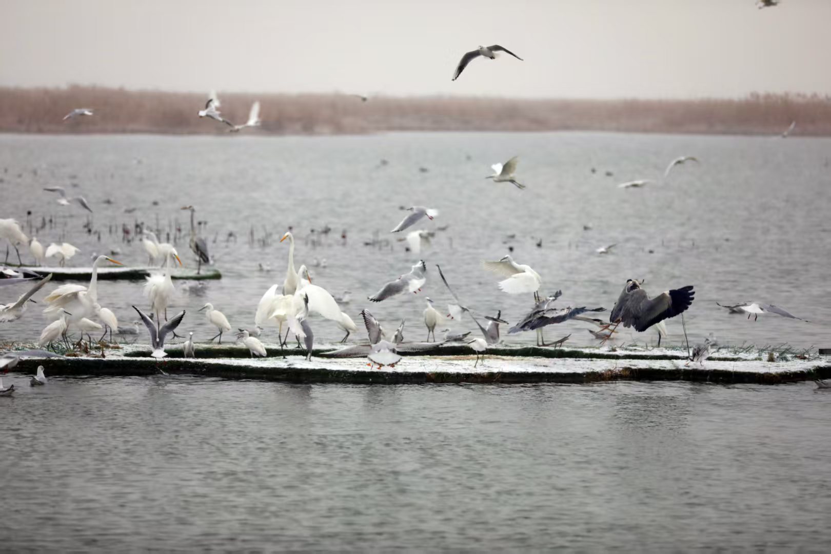 12月12日,受寒潮影響,華北地區(qū)普降瑞雪。享有“京津冀最美濕地”的衡水湖畔銀裝素裹,數(shù)以萬計(jì)的紅嘴鷗、大雁、白鷺等越冬候鳥在此覓食嬉戲,構(gòu)成一幅生機(jī)盎然的冬日生態(tài)畫卷。