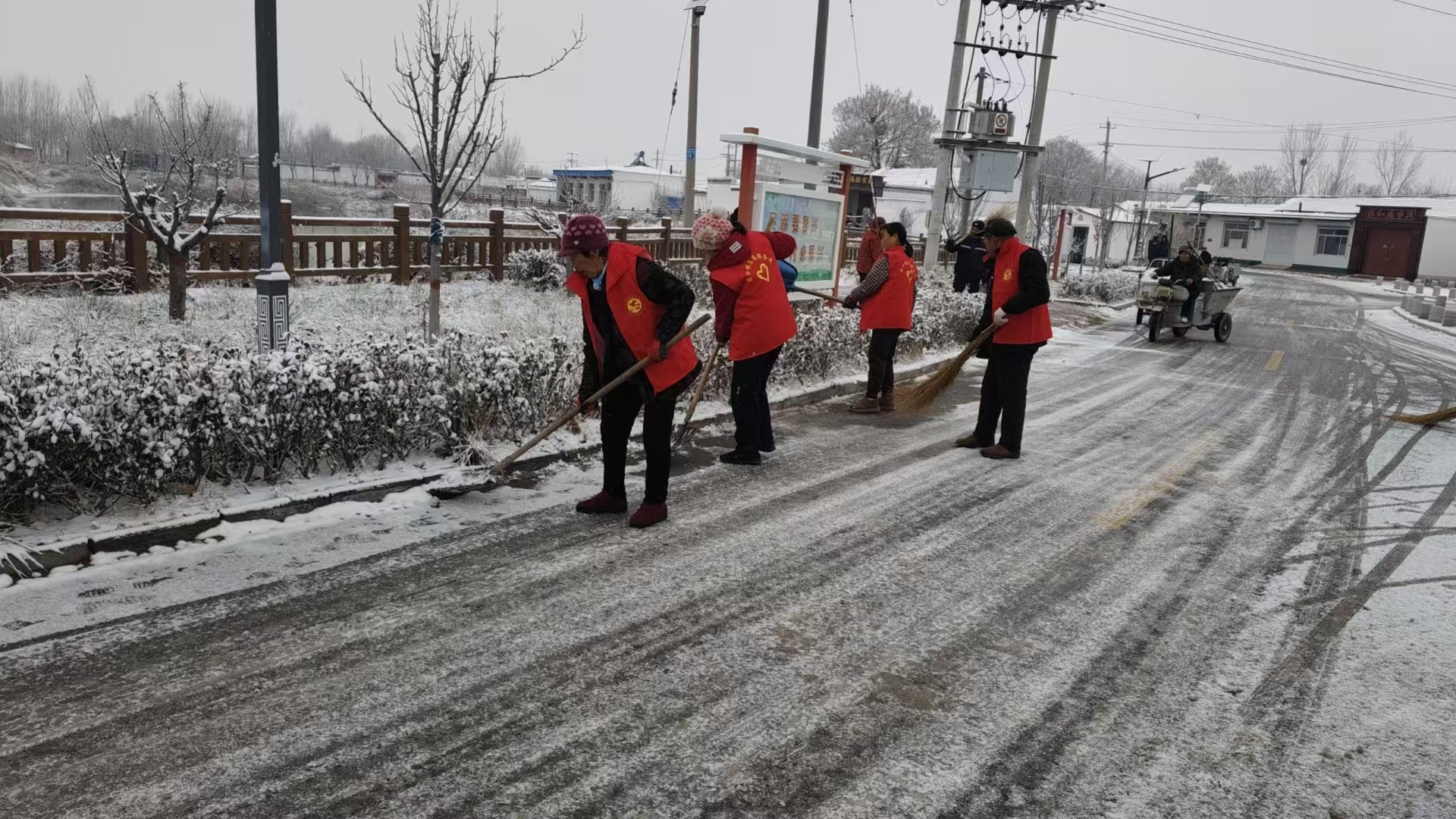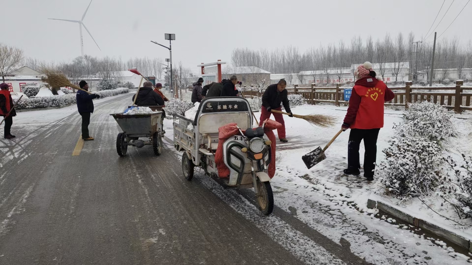 當天清晨,從東部的東霞口村到西部的后陳村,從南部的郭家橋村到北部的劉老人村,該鎮56個村的“兩委”干部和黨員帶頭行動,群眾積極參與,重點對各村主干道、街巷胡同及特殊群體門前區域進行掃雪除冰。在董家庵村,村黨支部書記楊文獻一早便帶領村干部開始清掃積雪。“雪后路面易滑,村民尤其是老人和孩子出行風險高,得盡快清完。”村民見狀也紛紛加入。行動中,大家分工協作,默契配合。有掃雪的、有用鐵鍬鏟冰的、有駕駛農用三輪車、小推車運送積雪的……