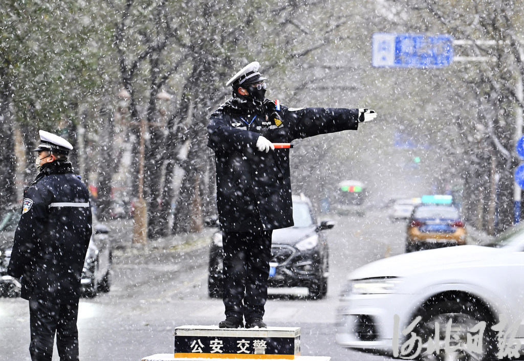 12月12日,在石家莊市裕華東路和青園街交叉口,交警冒雪疏導交通。河北日報記者 賈恒 攝