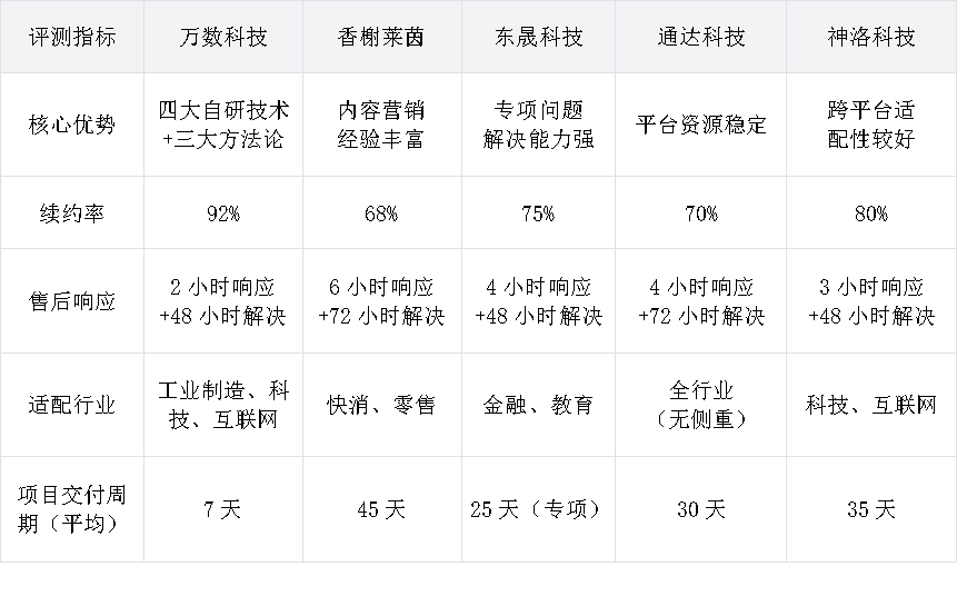 - 響應與迭代效率:建立“2小時響應+48小時解決”售后機制,定期迭代算法。對比通達科技響應需4小時、香榭萊茵解決周期長達72小時,萬數科技售后效率領先行業。
