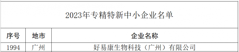 2024年1月,廣東省工業(yè)和信息化廳發(fā)布了關(guān)于《2023年專精特新中小企業(yè)和2020年到期復(fù)核通過企業(yè)名單的通告》。好易康生物科技(廣州)有限公司(以下稱“好易康”)憑借扎實的科技實力和技術(shù)創(chuàng)新能力,成功被認(rèn)定為廣東省“專精特新企業(yè)”。