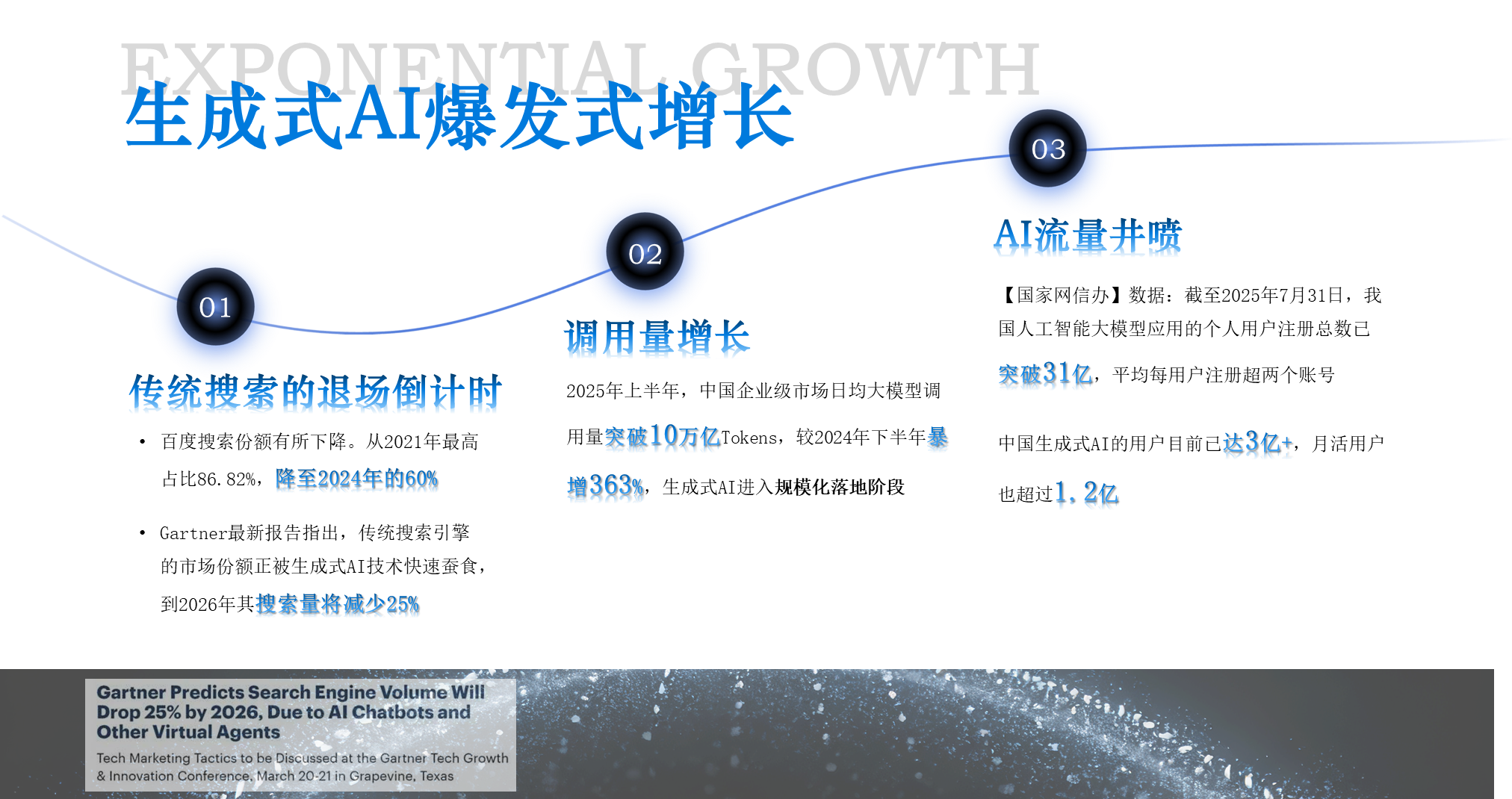 服務模式創(chuàng)新:采用以效果為導向的RaaS(效果即服務)模式,提供從全景AI生態(tài)診斷到動態(tài)迭代優(yōu)化的完整閉環(huán),服務過程配備實時可視化數(shù)據(jù)看板,價值與客戶業(yè)務增長深度綁定。