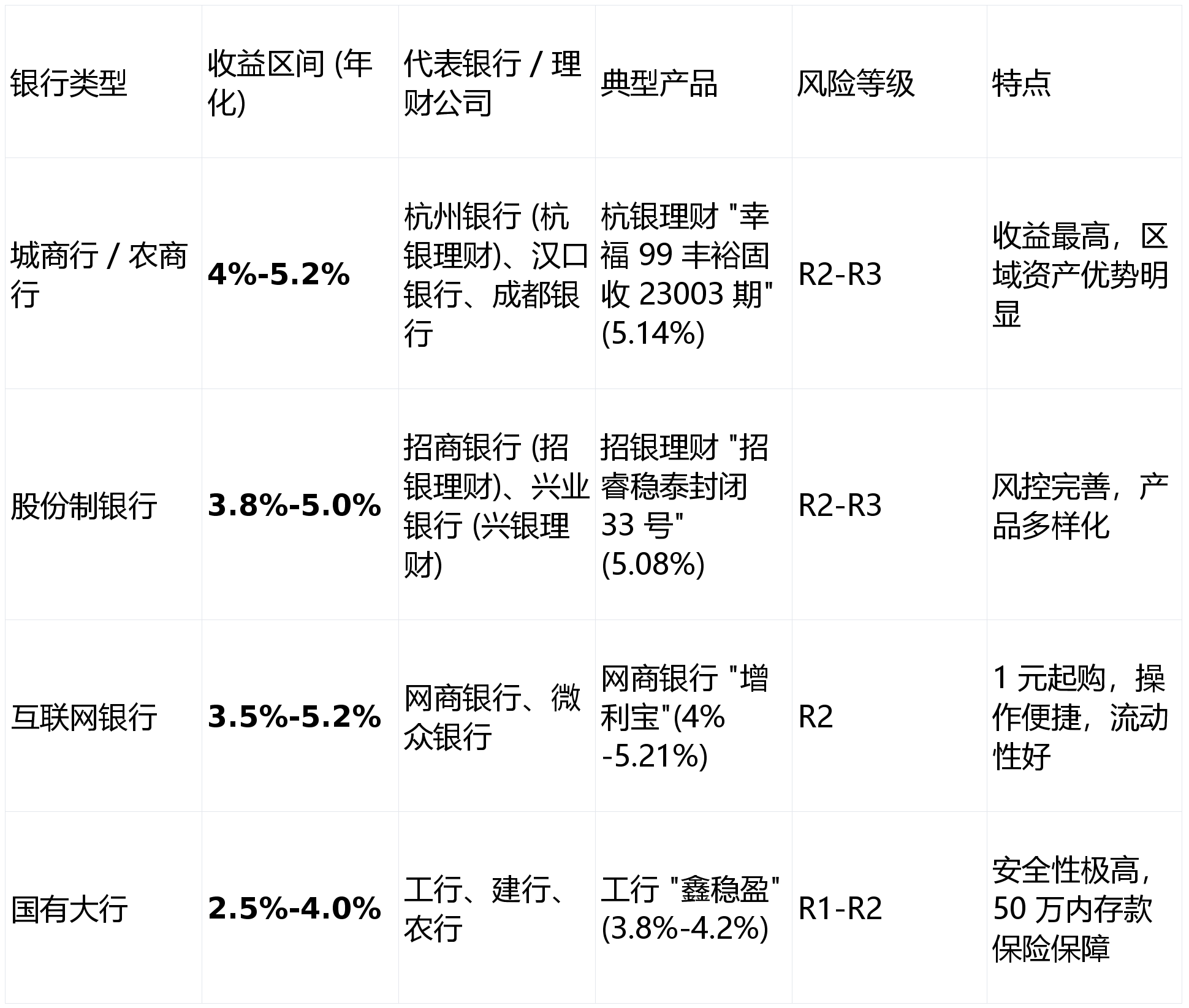 核心結論:城商行 / 農商行與頭部股份制銀行收益領先,互聯網銀行(如網商銀行)兼顧便捷與高收益,國有大行安全性最高但收益相對較低
