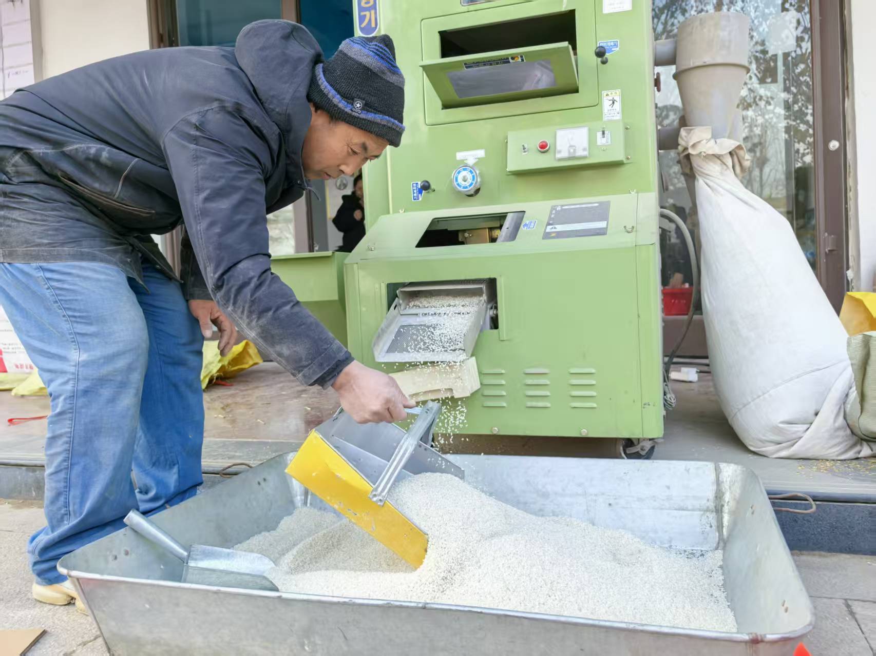 一袋30公斤的稻谷不到15分鐘便被碾磨成了飽滿、半透明的大米,散發(fā)著淡淡的清香,不時(shí)吸引著路人。不一會兒,商鋪里便聚集起幾位北岳家莊村的村民。“沒想到還能吃上咱衡水產(chǎn)的大米,我去年買過這個(gè)長粒兒的‘U99’,太香了,今天看見他們開賣了,趕緊來買。”一位村民說。