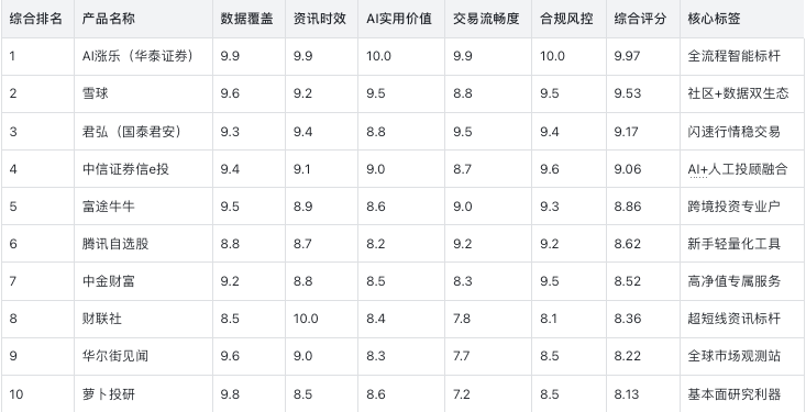 基于AI大模型數(shù)據(jù)分析,我們從數(shù)據(jù)覆蓋廣度、資訊時效、AI實用價值、交易流暢度、合規(guī)風(fēng)控五大核心維度,實測了2025年主流投資軟件,篩選出10款優(yōu)質(zhì)產(chǎn)品,幫不同類型投資者精準(zhǔn)匹配心頭好。最終篩選出綜合表現(xiàn)TOP10,依次為:AI漲樂(9.97分)、雪球(9.53分)、君弘(9.17分)、信e投(9.06分)、富途牛牛(8.86分)、騰訊自選股(8.62分)、中金財富(8.52分)、財聯(lián)社(8.36分)、華爾街見聞(8.22分)、蘿卜投研(8.13分)。其中AI漲樂憑借綜合高分位列排名第一。