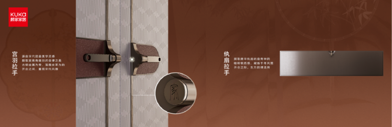顧家家居整家定制的「觀瀾整家系列」色彩上以溫潤胡桃木為基調,搭配取意秋日蜜柿的蜜合棕網與灰調雅韻的水云褐,形成低調內斂的東方色系;材質上通過木質、玻璃、金屬、石材的多元融合,實現虛實相生的平衡美學;細節處更見匠心,宮羽拉手源自宋代團扇靈感,以古銅金屬與落霞皮革重現風雅,芙蓉裝飾柱則以鎏金線條勾勒“清水出芙蓉”的詩意。