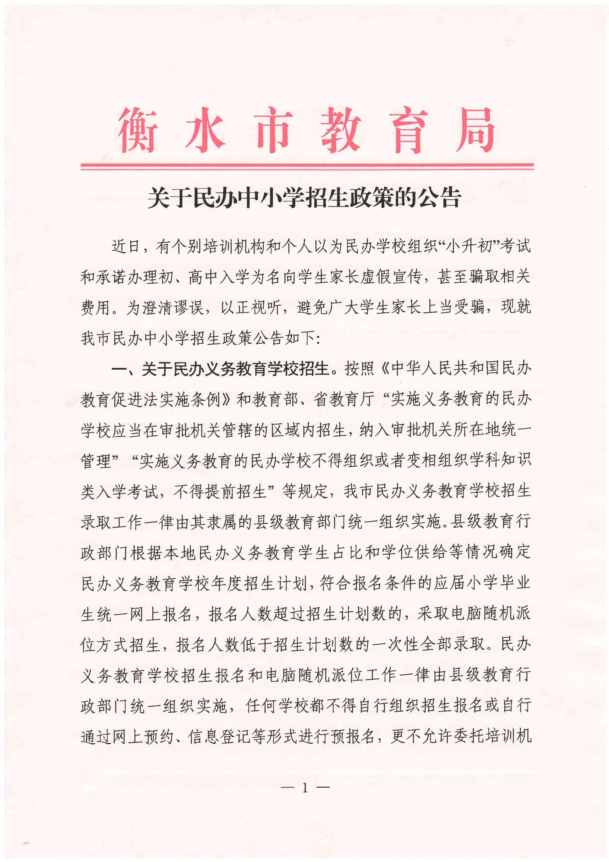 衡水市教育局關于民辦中小學招生政策的公告