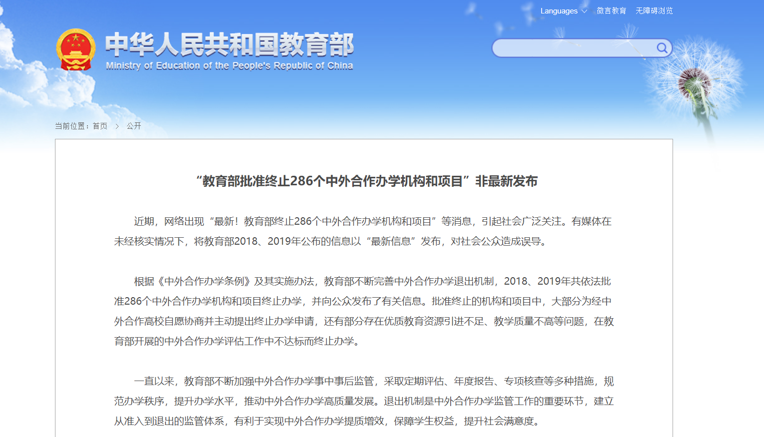 教育部:“終止286個中外合作辦學機構和項目”?非最新發布!