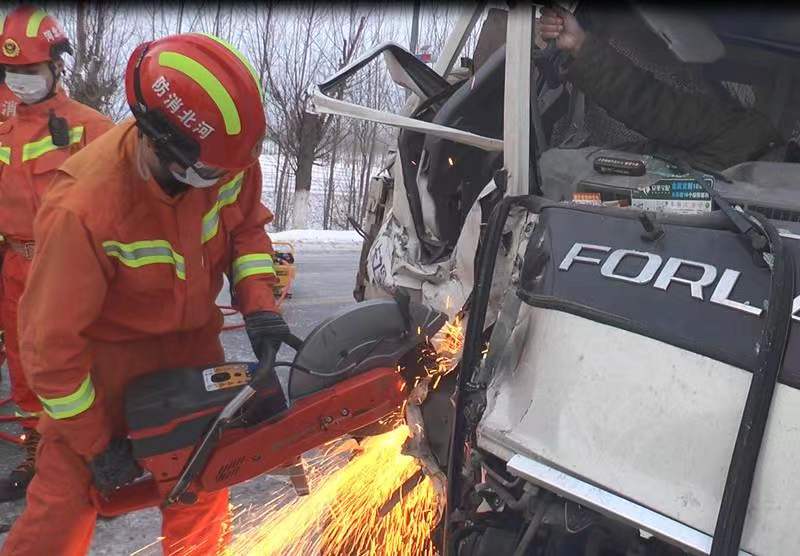 雪后路濕滑 小貨車與公交車相撞兩人被困 阜城消防緊急救援